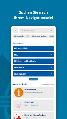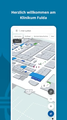 Die Klinikum Fulda App ist Ihr persönlicher Navigator, der Ihnen präzise den Weg weist. Von Ihrer Haustür bis zum zugewiesenen Parkplatz und weiter, direkt zum gewünschten Behandlungszimmer, der jeweiligen Station, einer spezialisierten Fachabteilung oder der Ambulanz – eine detaillierte Wegbeschreibung ist stets nur wenige Klicks entfernt. Darüber hinaus macht die schnelle Suchfunktion das Auffinden von Kliniken, Abteilungen, dem zuständigen medizinischen Personal oder wichtigen Anlaufpunkten wie der Eingangshalle, Sanitäranlagen und Wartebereichen zum Kinderspiel.