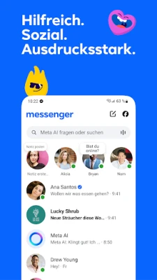 Mit Messenger bleiben Sie mühelos in Verbindung, ganz gleich, wo Ihre Liebsten sind. Entdecken Sie eine Welt der Kommunikation, die über Grenzen hinausgeht und es Ihnen ermöglicht, Familie und Freund*innen einfach zu finden und zu kontaktieren, auch ohne Telefonnummer. Ob persönliche Gespräche oder der Austausch mit Ihrer Community, von der Schulgruppe bis zu gleichgesinnten Netzwerken – Messenger ist Ihr zentraler Hub für bedeutungsvolle Interaktionen. Erleben Sie lebendige Unterhaltungen mit einer Fülle an animierten Stickern, GIFs und Reaktionen, die jeder Nachricht eine persönliche Note verleihen. Und gestalten Sie Ihre Chats mit thematischen Designs, die sich stetig anpassen und immer wieder aufs Neue begeistern.