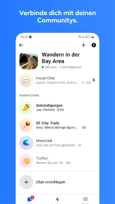 Der Messenger verbindet dich kostenlos mit Freund*innen und Familie. Bleib in Kontakt, verfolge Interessen mit Gleichgesinnten, bau eine Community auf und teile deinen Vibe – alles in einer App!