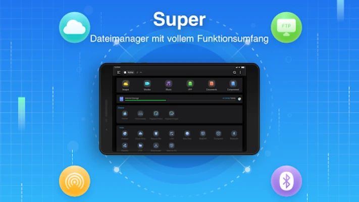Super File Manager geht weit über die lokale Organisation hinaus. Verbinden Sie sich mühelos mit Ihren Netzwerkgeräten dank umfassender Unterstützung für Protokolle wie SMB2.0, NAS, NFS, CIFS, FTP, HTTP, FTPS, SFTP und WebDAV. Greifen Sie nahtlos auf Dateien auf externen Speichermedien über USB OTG zu, egal ob FAT32, exFat oder NTFS. Zudem verknüpfen Sie Ihren Webspeicher kostenfrei mit Diensten wie Google Drive™, Dropbox, OneDrive und Yandex, um stets Zugriff auf Ihre Cloud-Daten zu haben. Komprimieren und dekomprimieren Sie Ihre Dateien in gängigen Formaten wie Zip, Rar, 7zip und obb für effizienten Transfer und Speicherung.